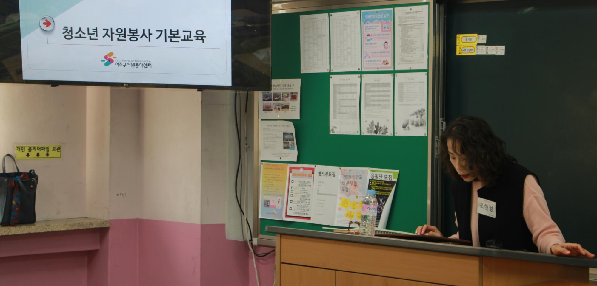 이번 달에만 세 번째로 여러분을 찾아뵙는 자원봉사 기본교육! 이번 기본교육은 신반포중학교에서 진행되었습니다. 중학교 1학년들을 대상으로 자원봉사의 의미를 알려주기 위해 이번에도 자원강사팀과 착한안테나가 함께 하였습니다.