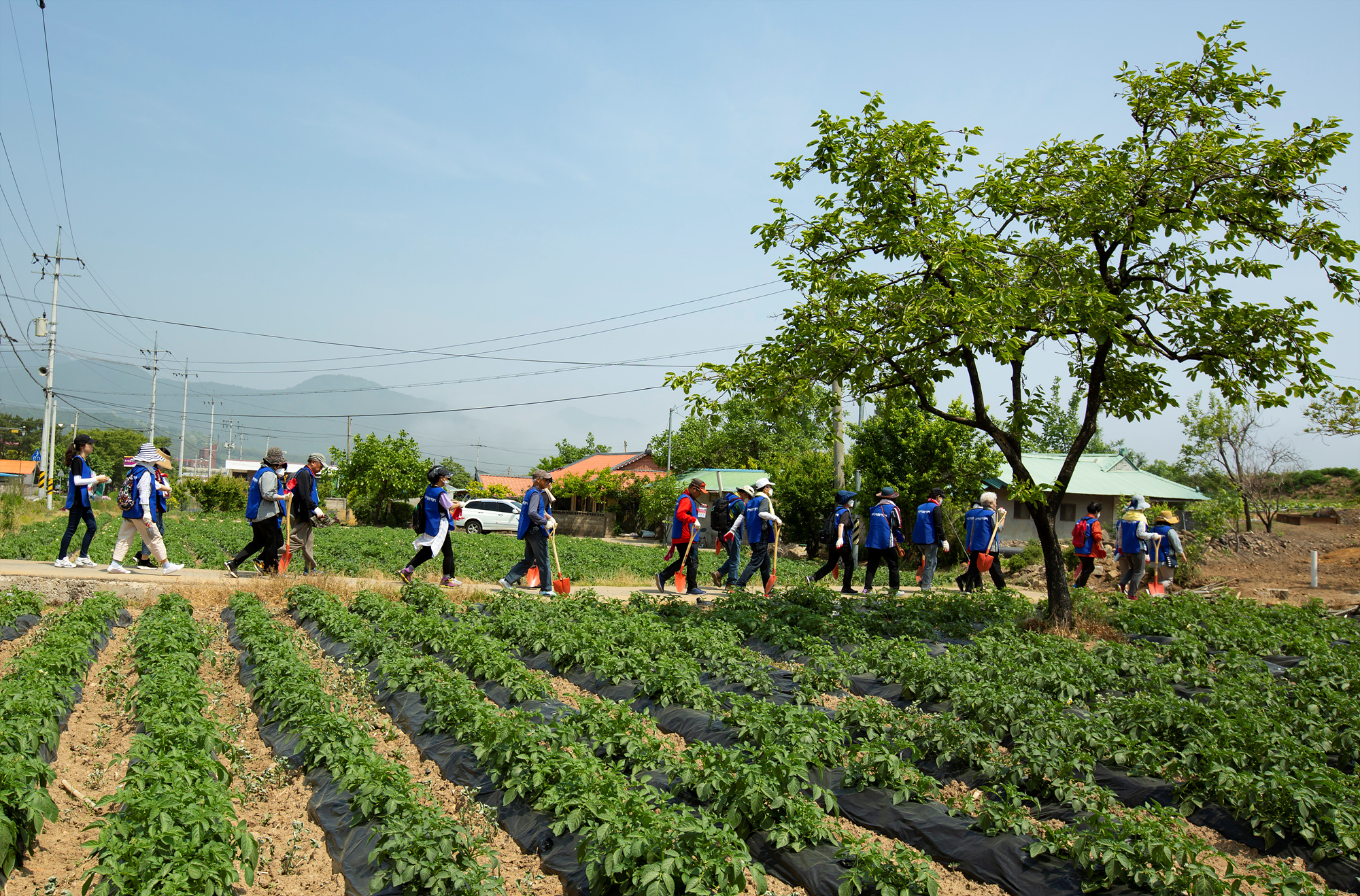 덩어리진 흙을 고루 펴고, 돌맹이를 걸러내고, 나무 심을 자리를 열심히 파며 구슬땀을 흘리는 모습!