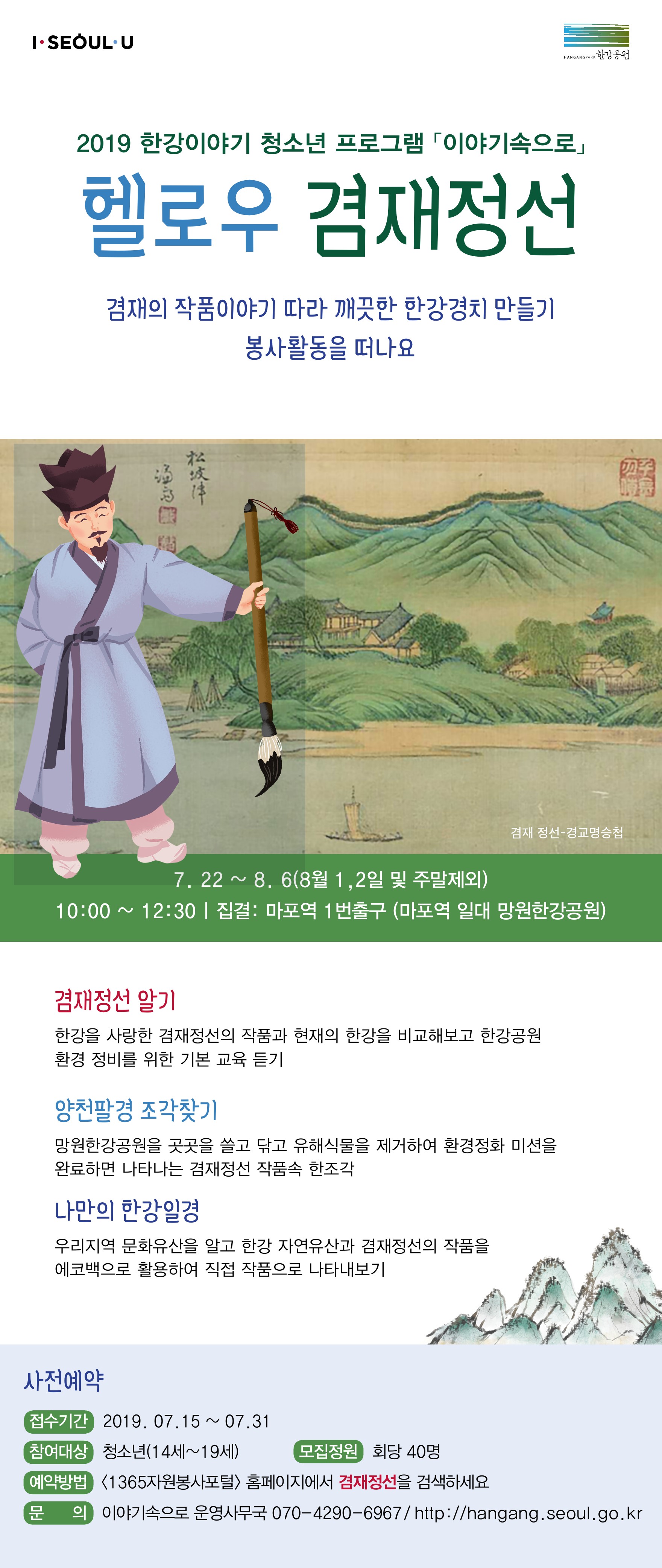 서울시 한강사업본부는 한강의 역사·문화적 가치를 알리고 유익한 즐길거리를 제공하고자 한강 이야기를 활용한 청소년 대상 시민프로그램 - 헬로우 겸재정선을 신규 운영하고자 합니다. 본 프로그램은 겸재정선의 한강 그림을 주제로 겸재정선이 사랑한 옛 한강처럼 깨끗한 한강 경치를 만드는 자원봉사 프로그램입니다.