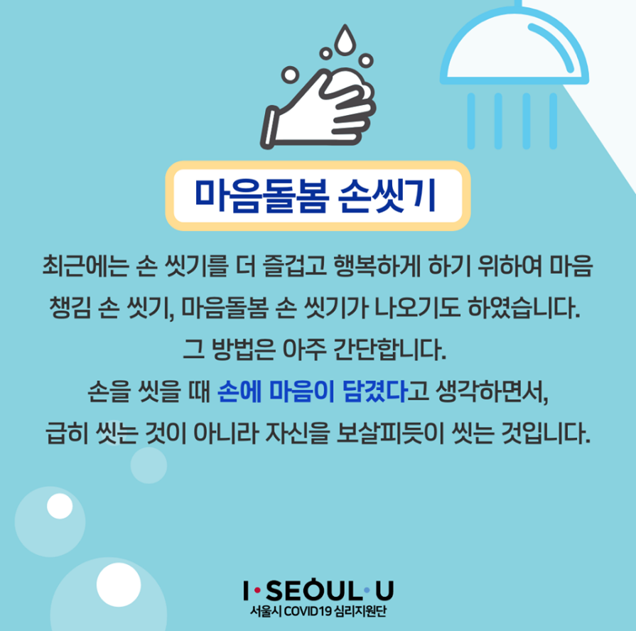 서울 시민들의 심리 면역력을 강화하는 행동 비타민 5가지 중 두번째, 마음의 공포까지도 닦아내는 마음돌봄 손 씻기, 행복한 손 씻기