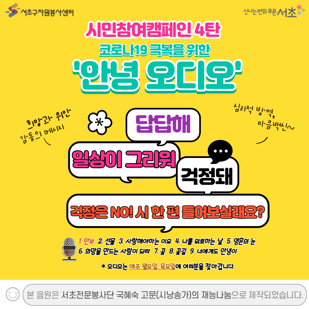요즘 만나지 못해 보고 싶은 지인들에게 시낭송 전문가 국혜숙 님의 목소리로 '안부'를 전해 보시면 어떨가요?
