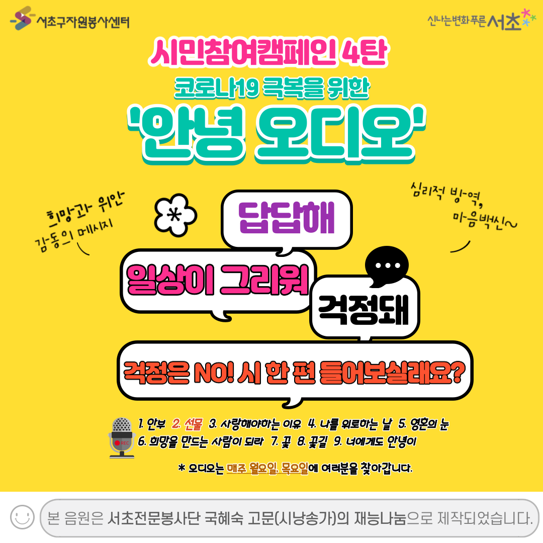 | [코로나에 대처하는 시민 제안]내가먼저IDO 4탄 - 코로나19 극복을 위한 '안녕 오디오' 1집(1-3) (0) | 2020.04.09 |