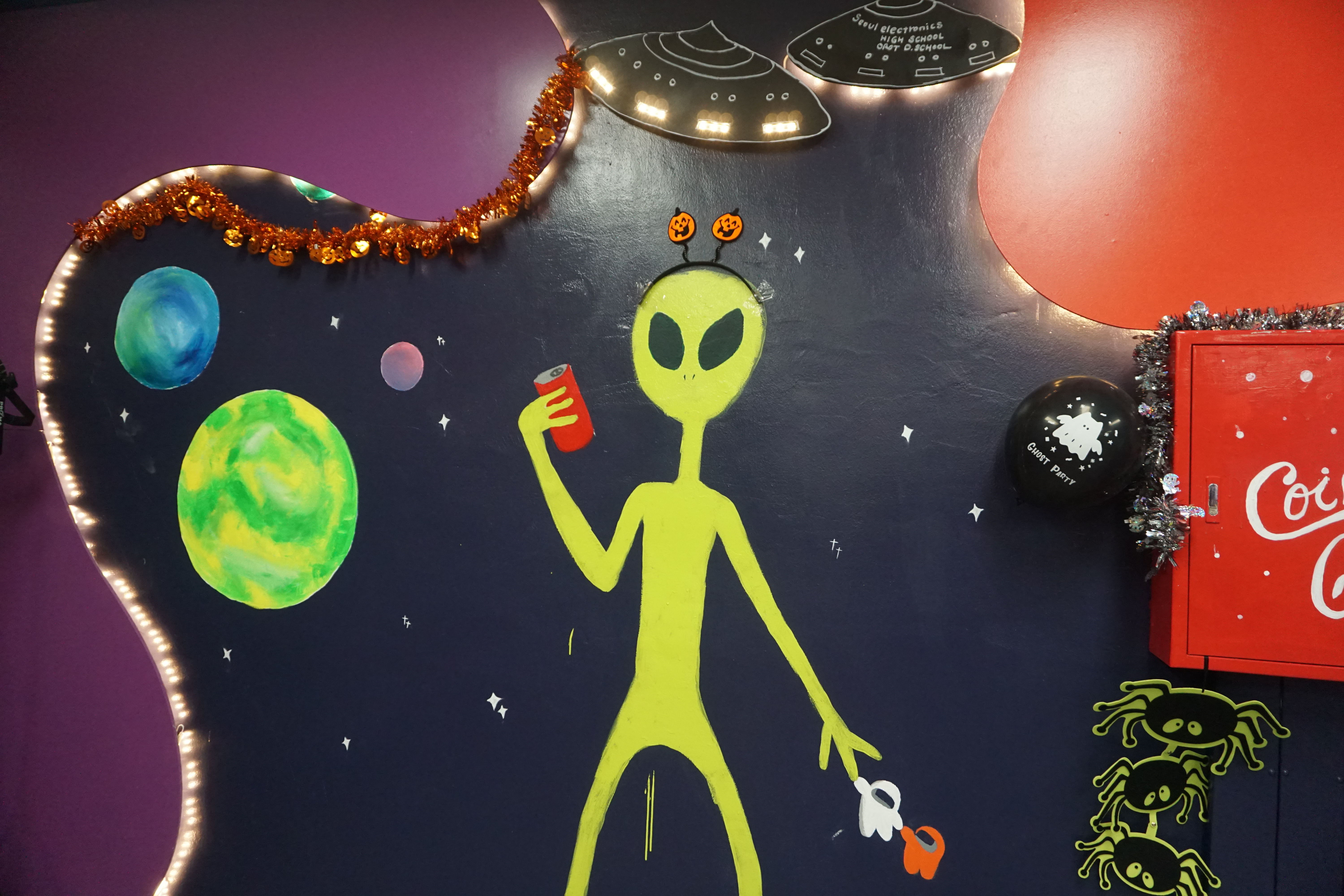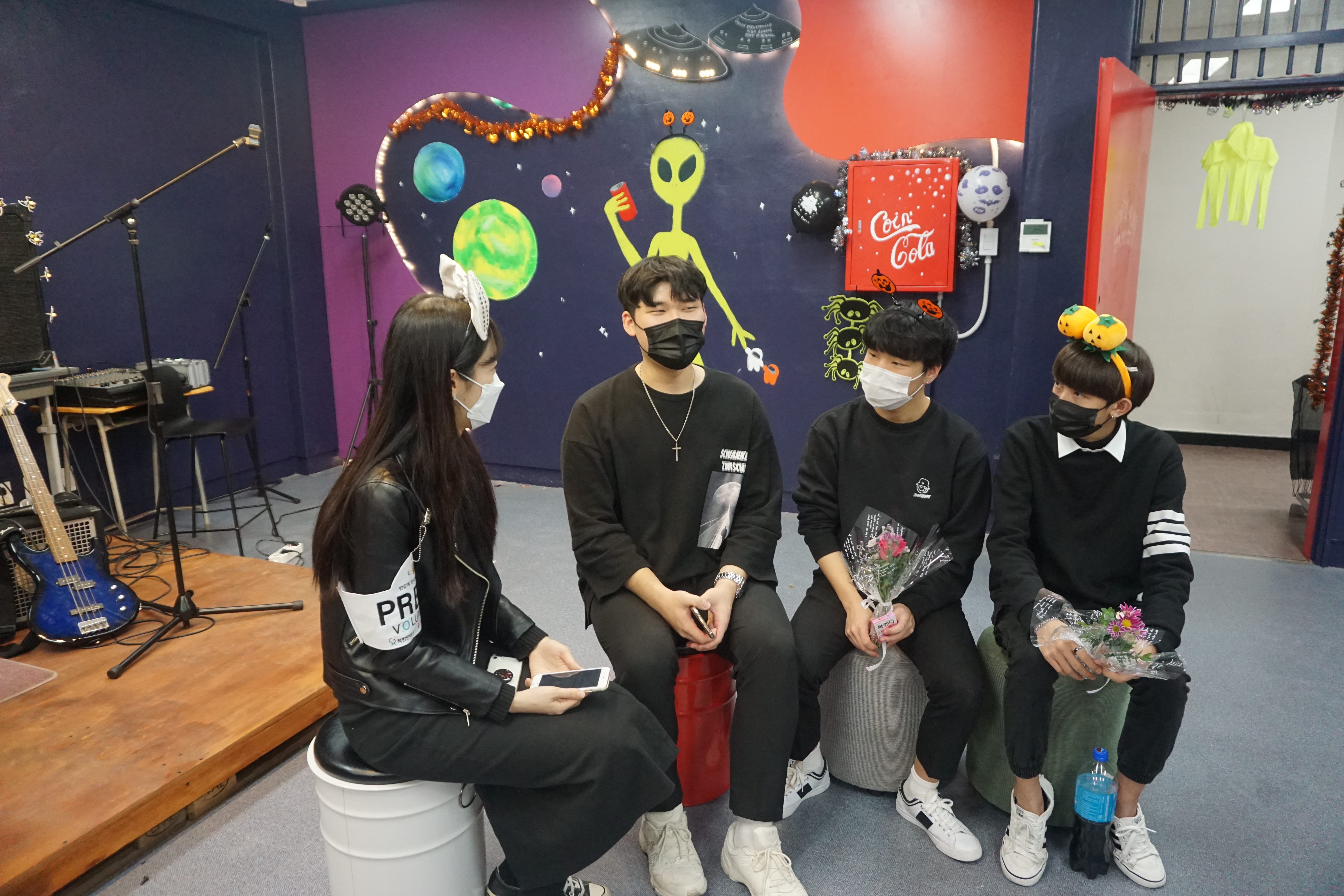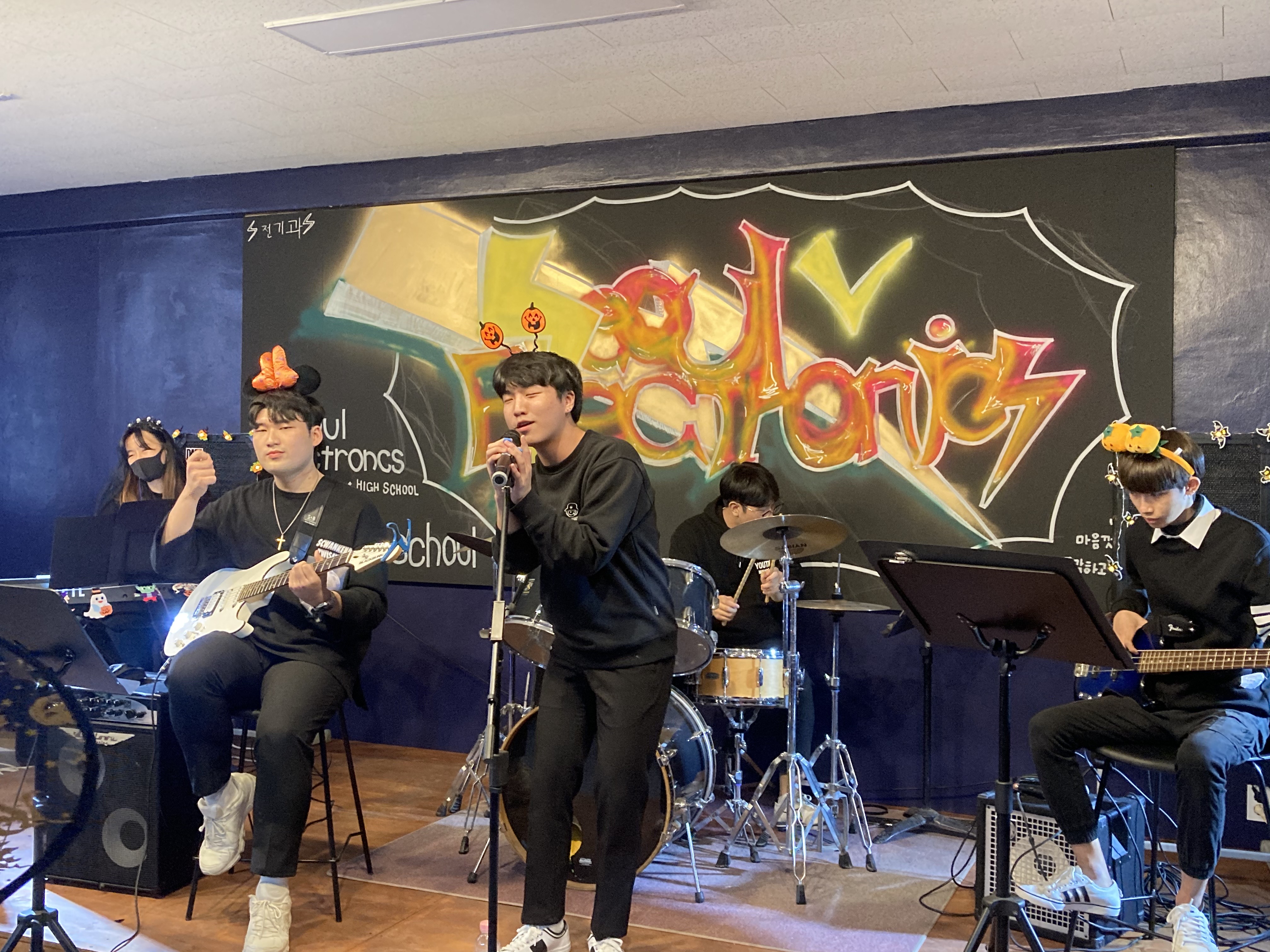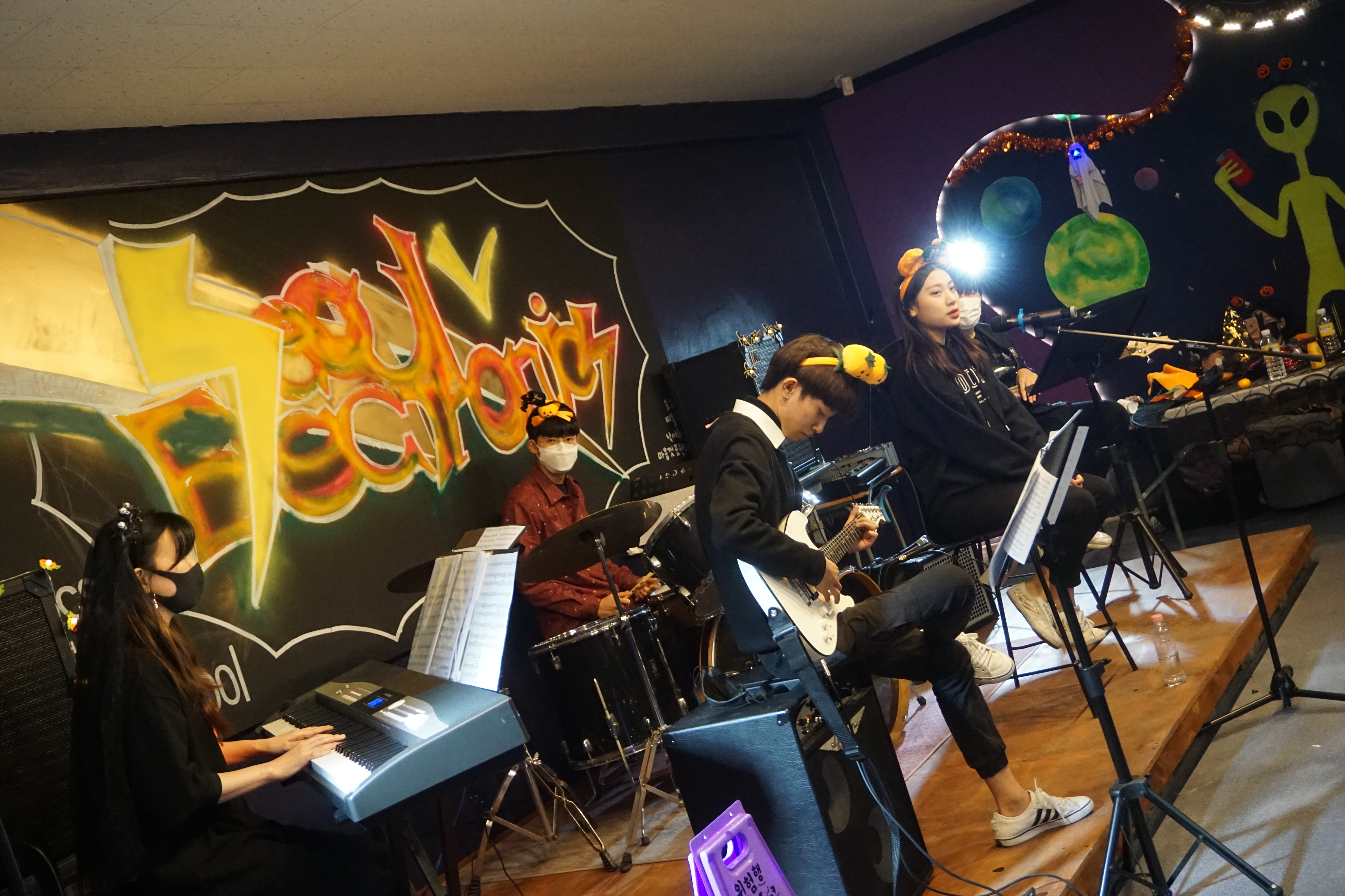 공연을 할 장소는 빈 교실이었는데요! 행사를 위해 밴드부뿐만 아니라 다른 동아리 친구들과 힘을 합쳐서 새롭게 만든 공간이라고 합니다. 정말 멋진 공간으로 변했죠?