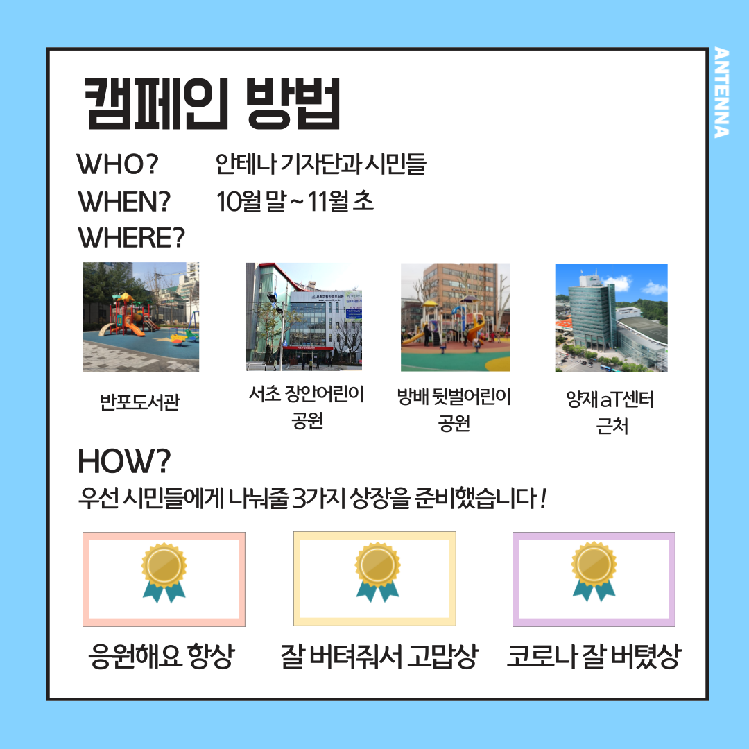 지난 2주동안 서초구 내 방배/반포/서초/양재 일대에서 시민들에게 상장수여식을 진행한 착한안테나들!!