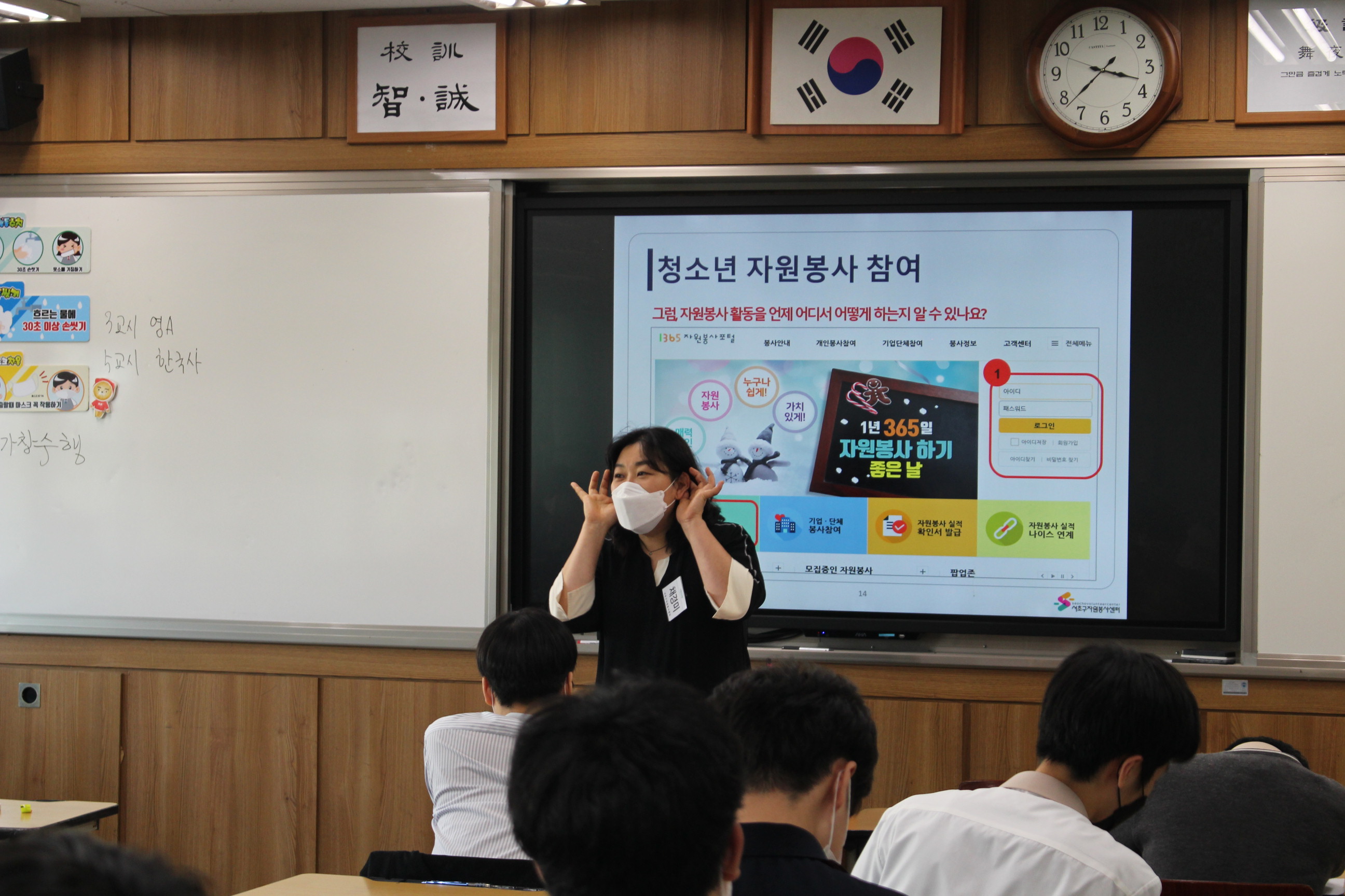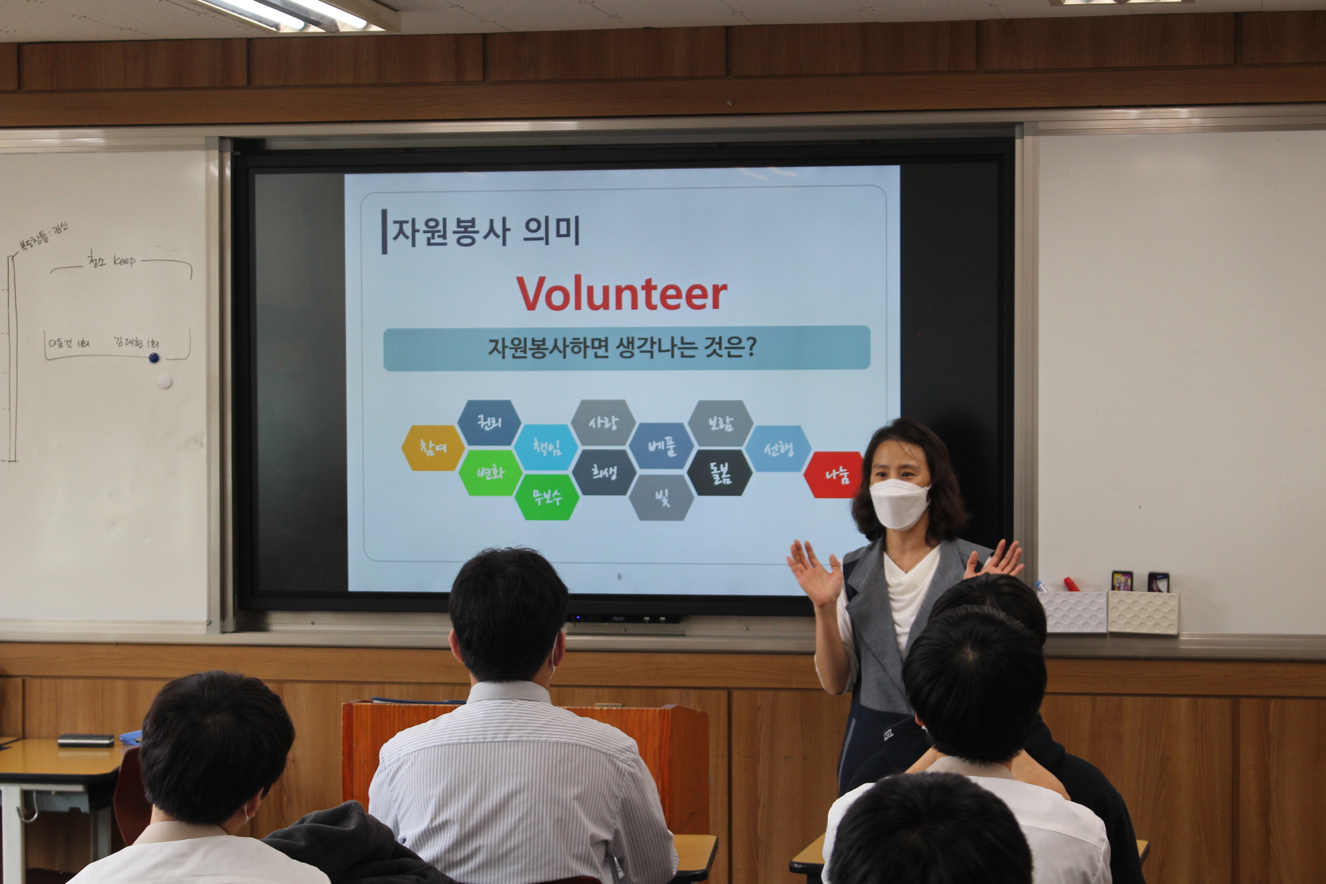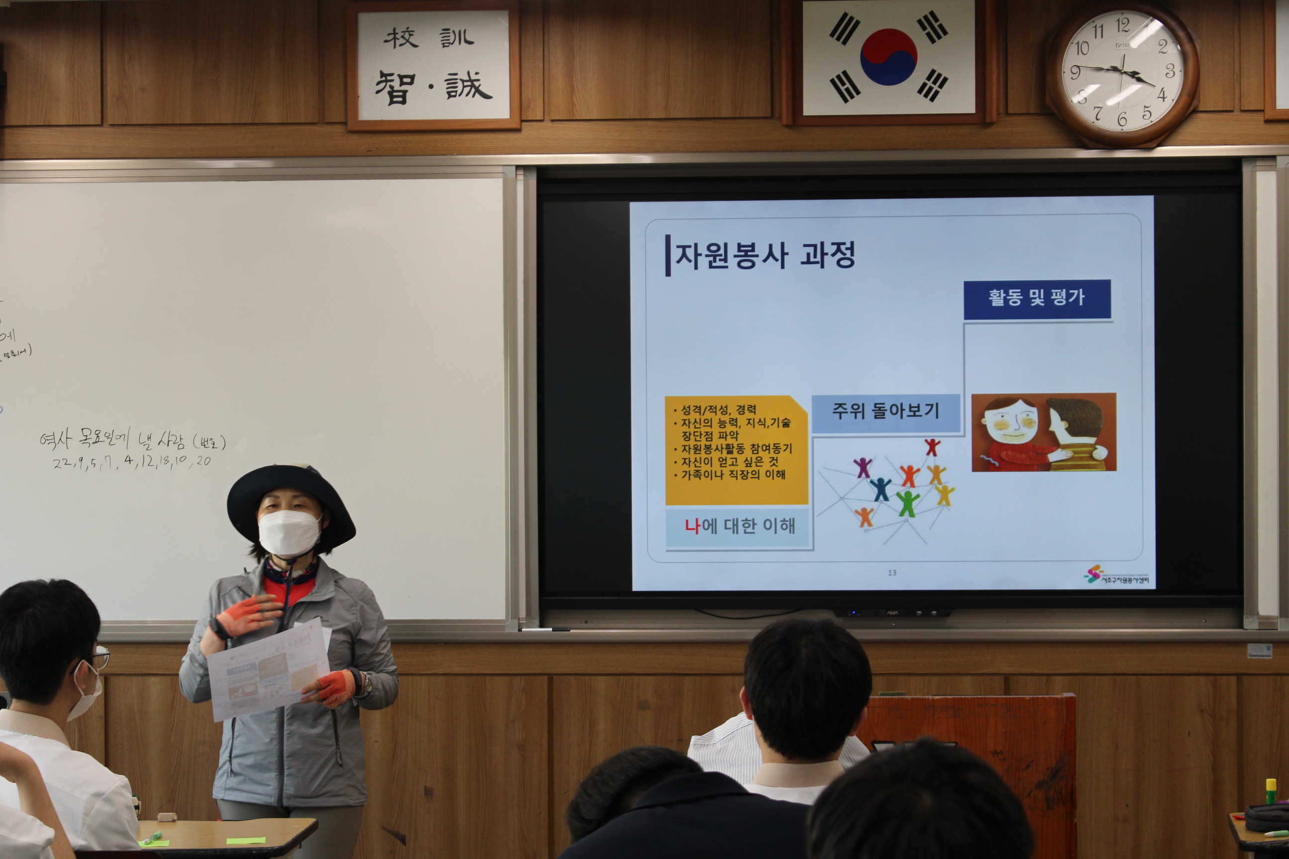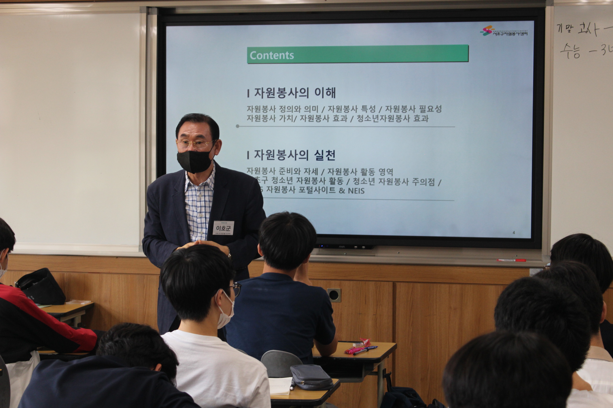 이어서 자원봉사의 정의/의미의 변화/자원봉사의 특성/청소년들이 자원봉사에 참여하는 방법 을 강의하며