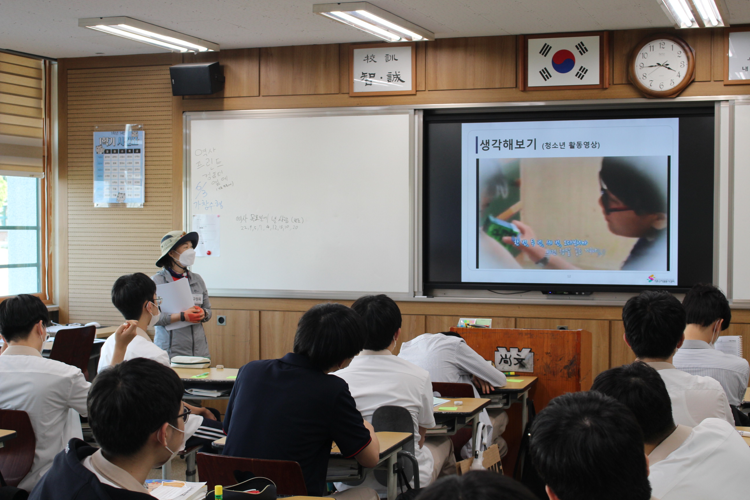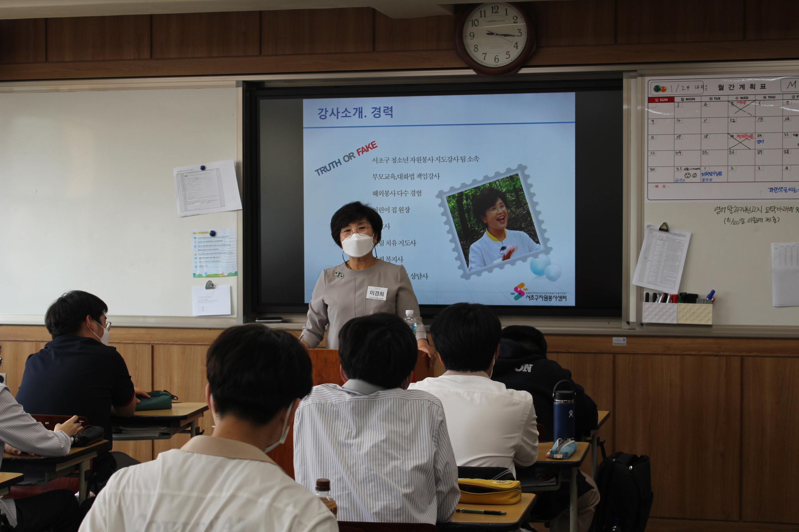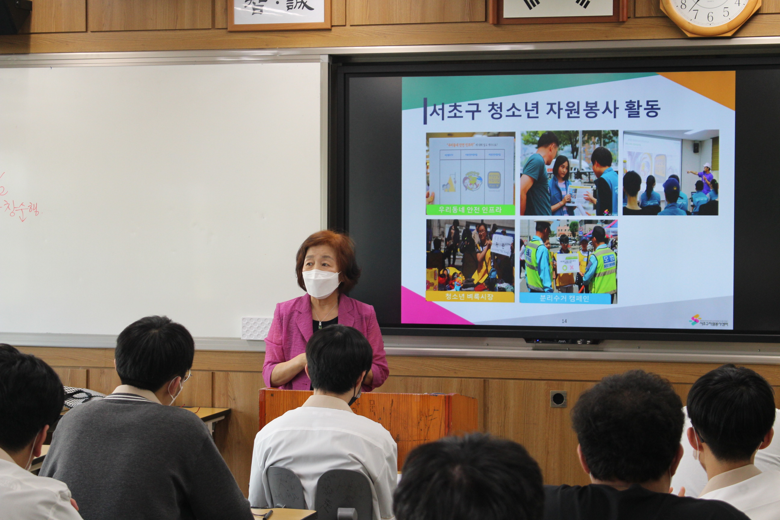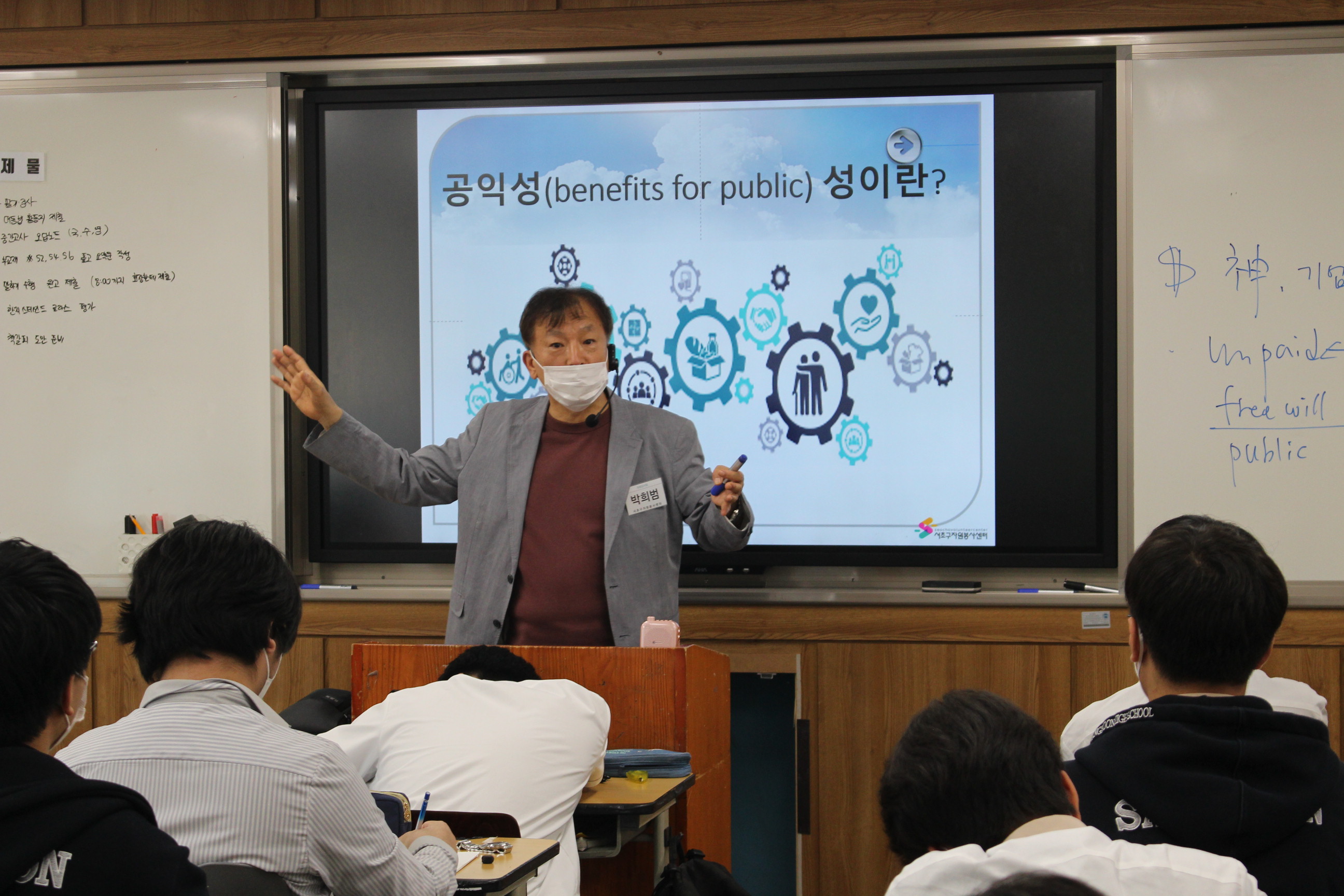 이어서 자원봉사의 정의/의미의 변화/자원봉사의 특성/청소년들이 자원봉사에 참여하는 방법 을 강의하며