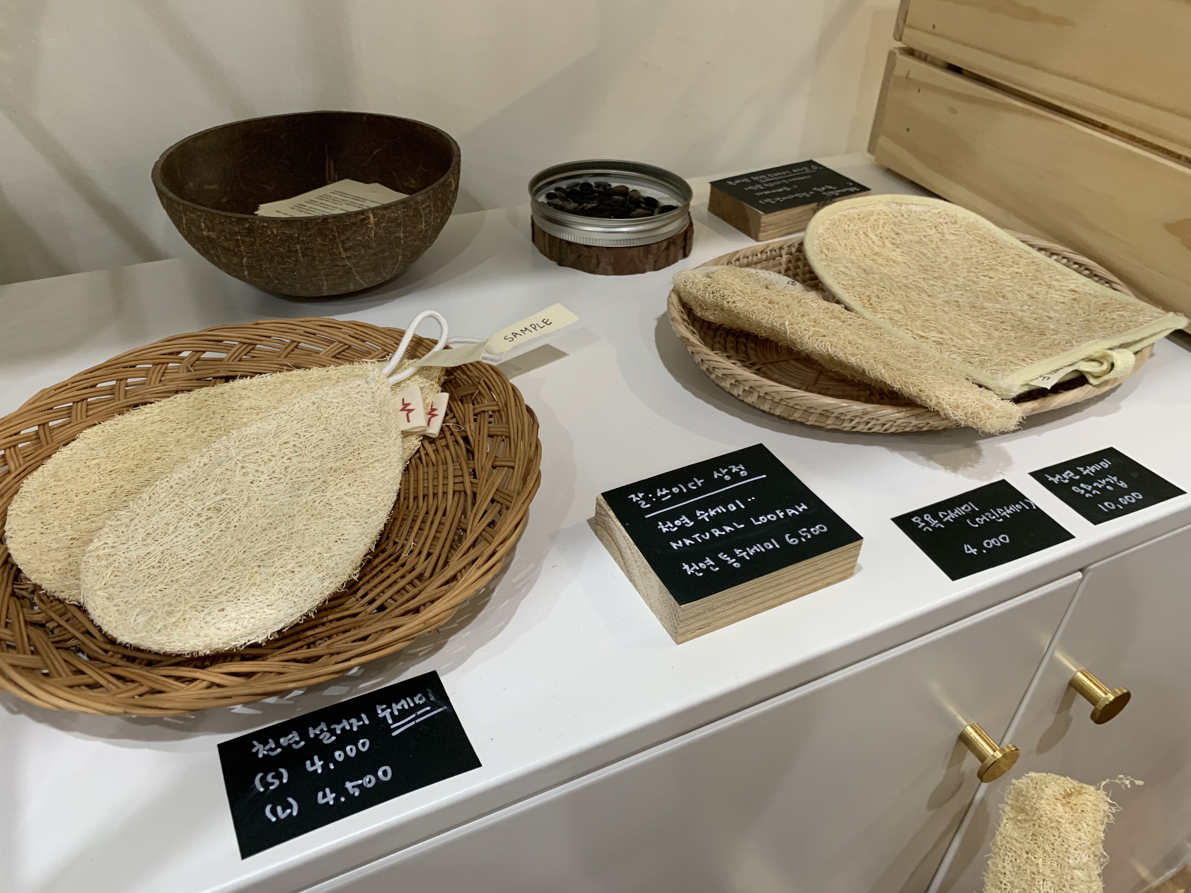 용기를 가져와 직접 유기농현미 등을 담아갈 수 있는 리필스테이션부터 천연 수세미, 대나무칫솔, 소프넛세제, 친환경 노트까지! 일상 속에서 쉽게 쓰이고 있는 자그마한 물품들이 제로웨이스트와 만나, 환경을 위한 물품으로 재탄생하였답니다. 제로웨이스트를 실천하려면 무언가 거창한 일을 해야 할 것만 같았는데, 그렇지 않아도 괜찮다는 듯 다독여주는 기분이었어요. 일상생활의 작은부분부터 바꾸어 나가도 된다는 메시지가 와 닿는 곳이었습니다.