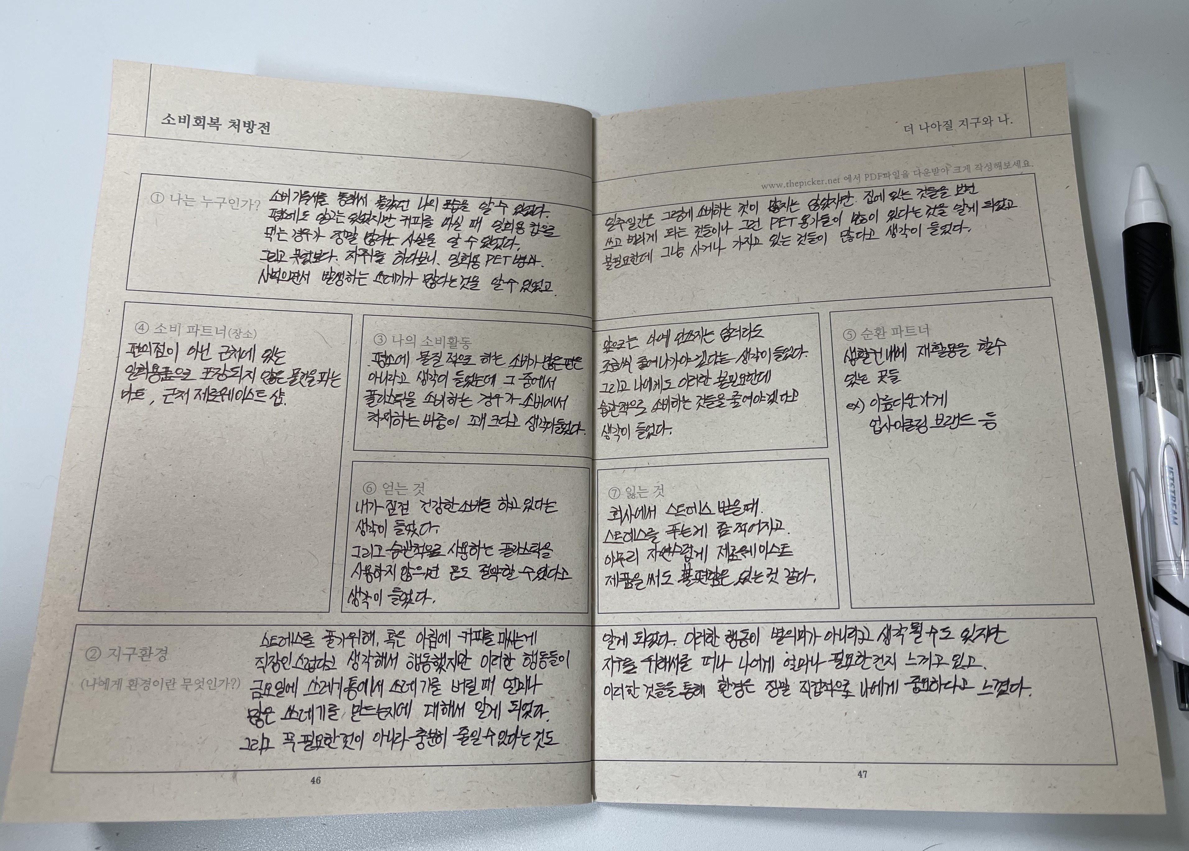 <일주일동안 제로웨이스트의 삶을 살고 더 피커 북에 그 내용을 적어보았습니다.>