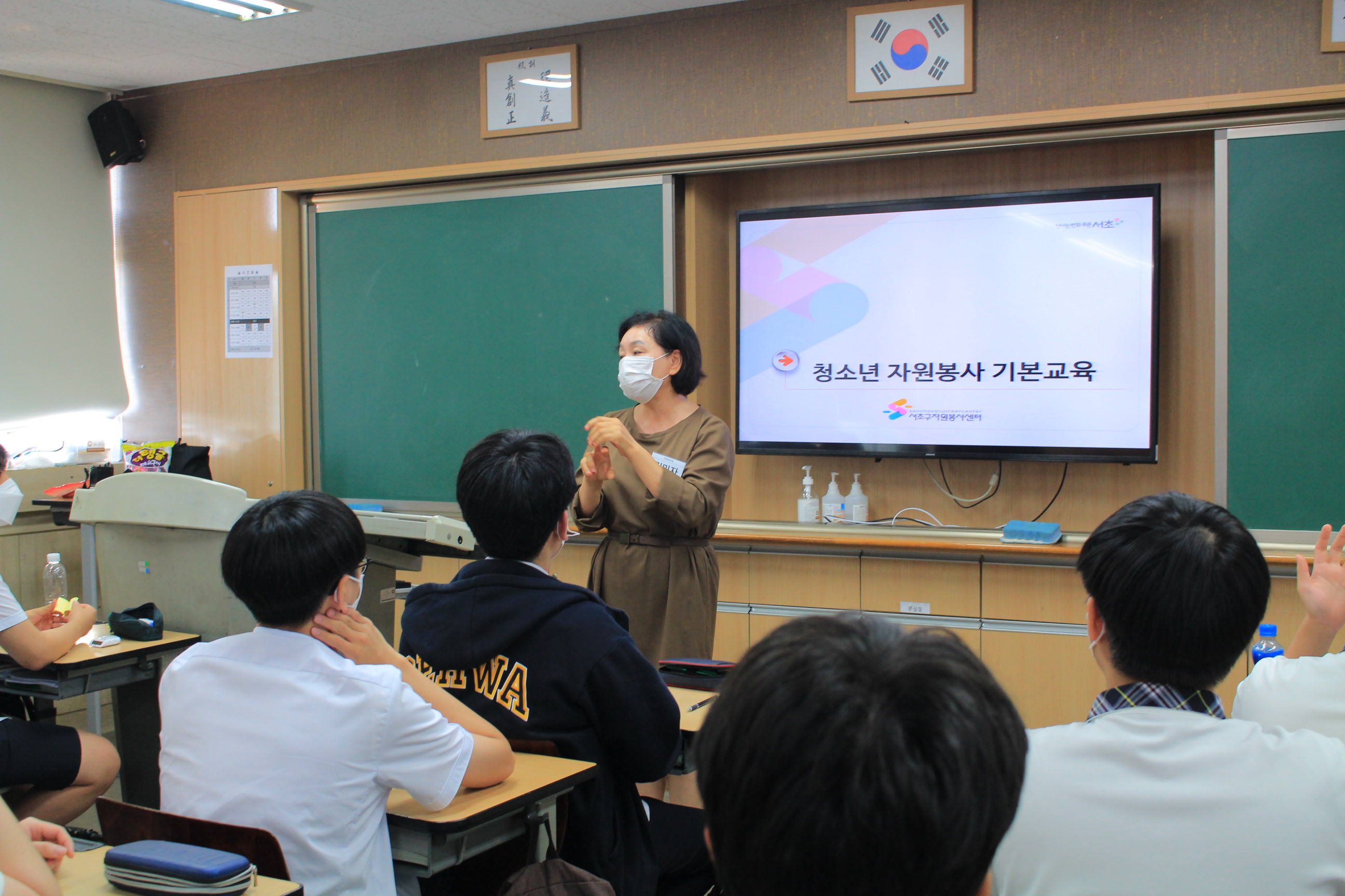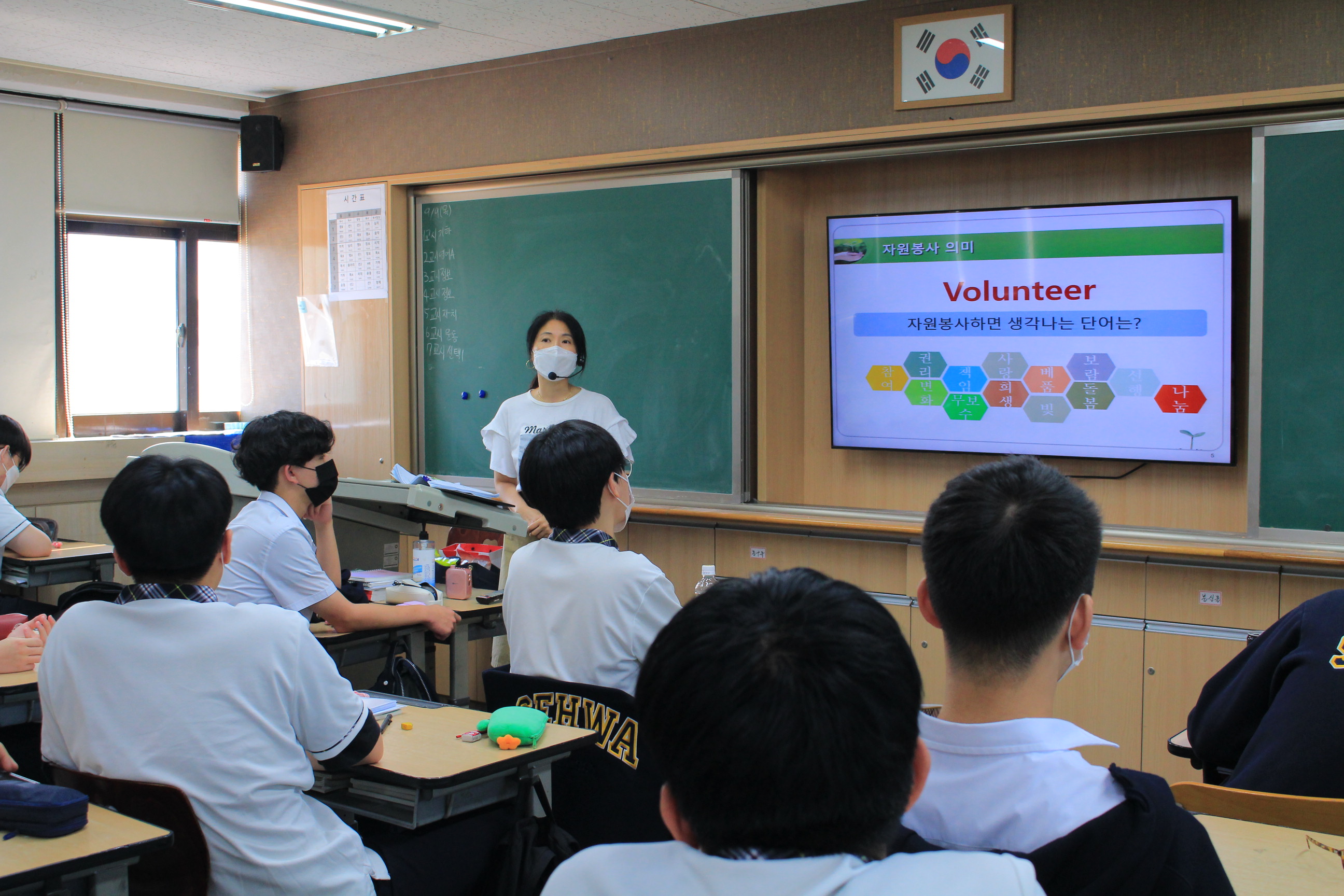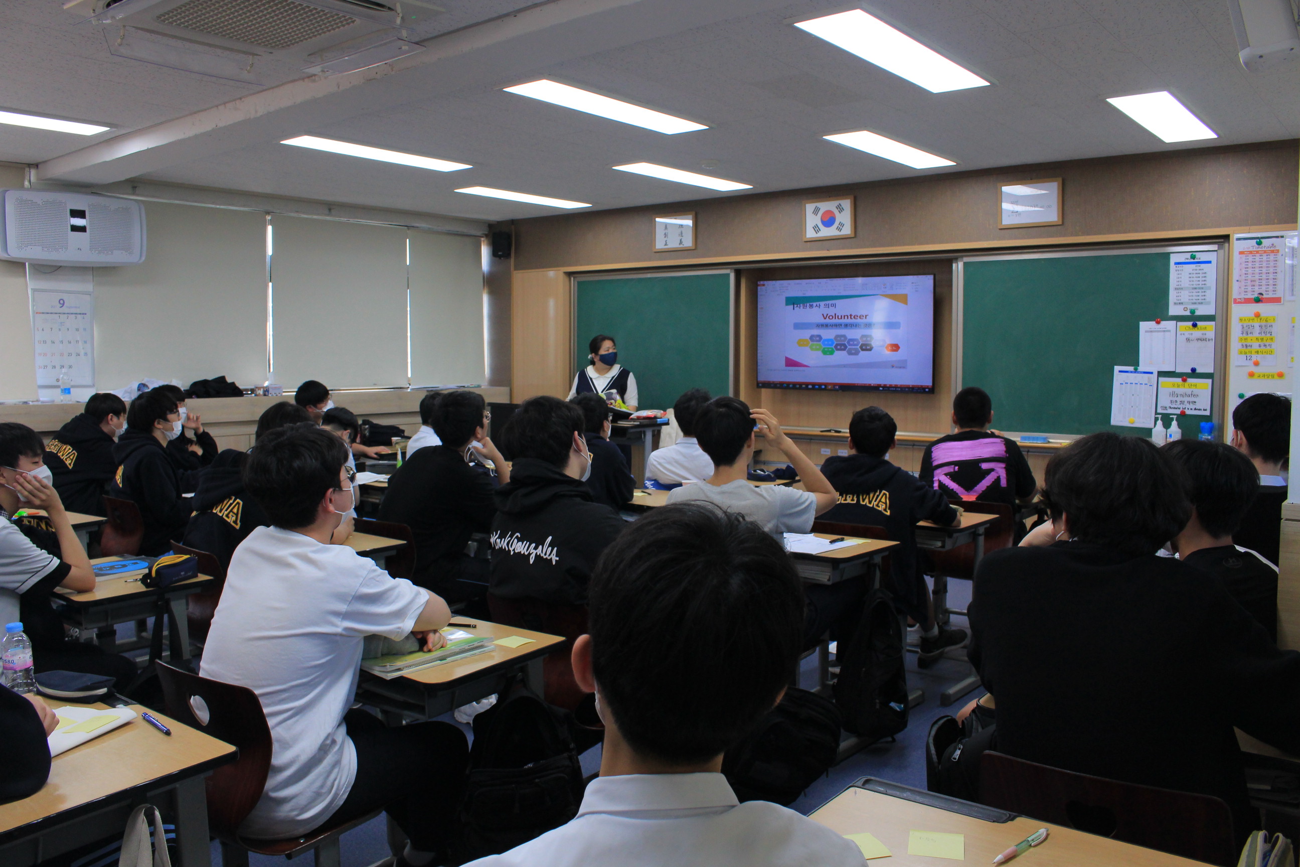 봉사의 개념부터 시작해, 봉사를 주제로 한 흥미로운 영상 컨텐츠와 프레젠테이션을 선보이셨는데요. 학생들의 눈높이에 맞게 봉사를 통해 만날 수 있는 진로 탐색 등 크게 도움이 될 알찬 수업이었습니다.