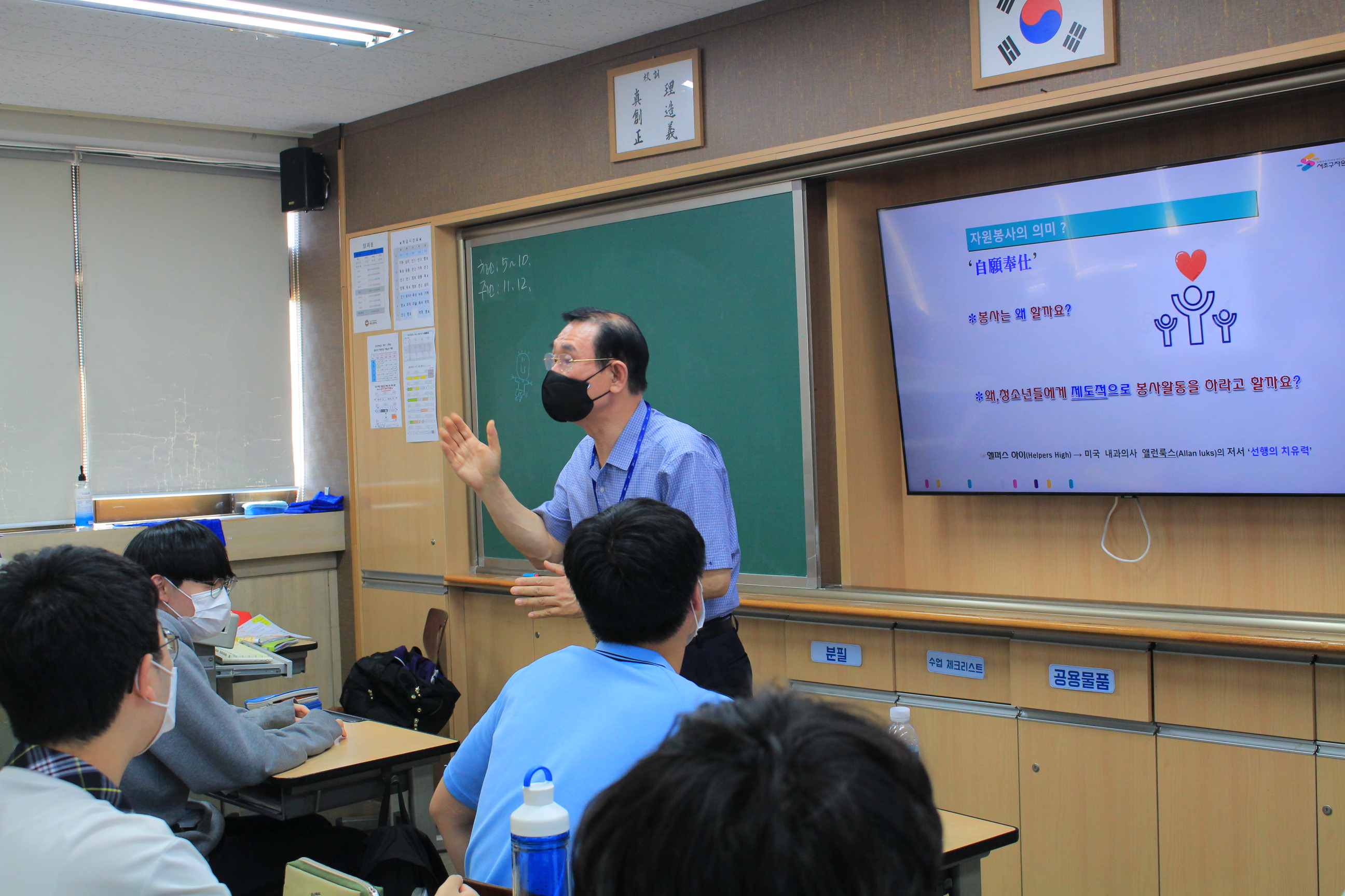 서초구자원봉사센터 직속 봉사 선생님들께서는 2학년 1반부터 11반까지 한 분씩 배치되어 ‘봉사’란 무엇인가에 대해 수업을 진행해주셨습니다.