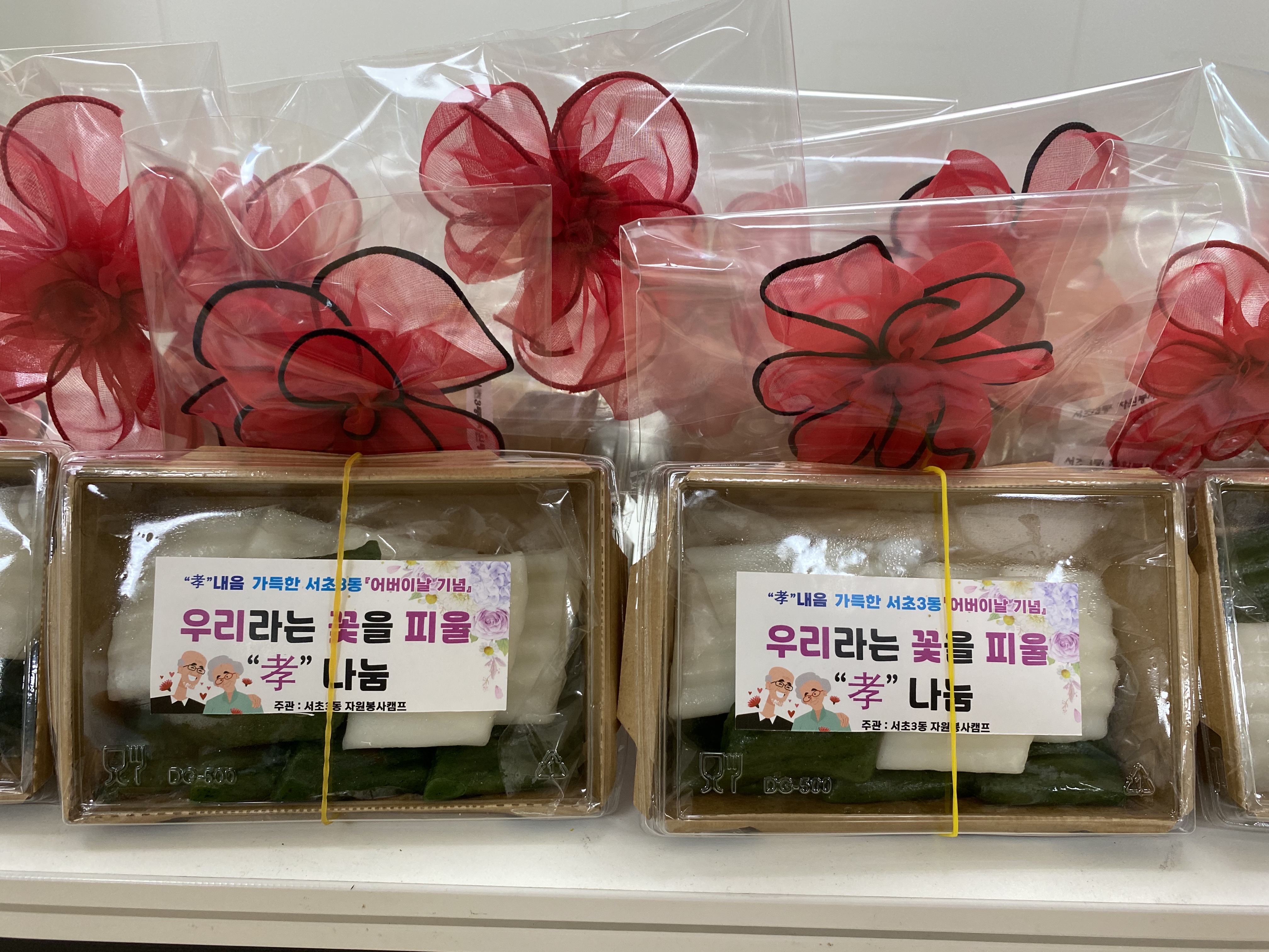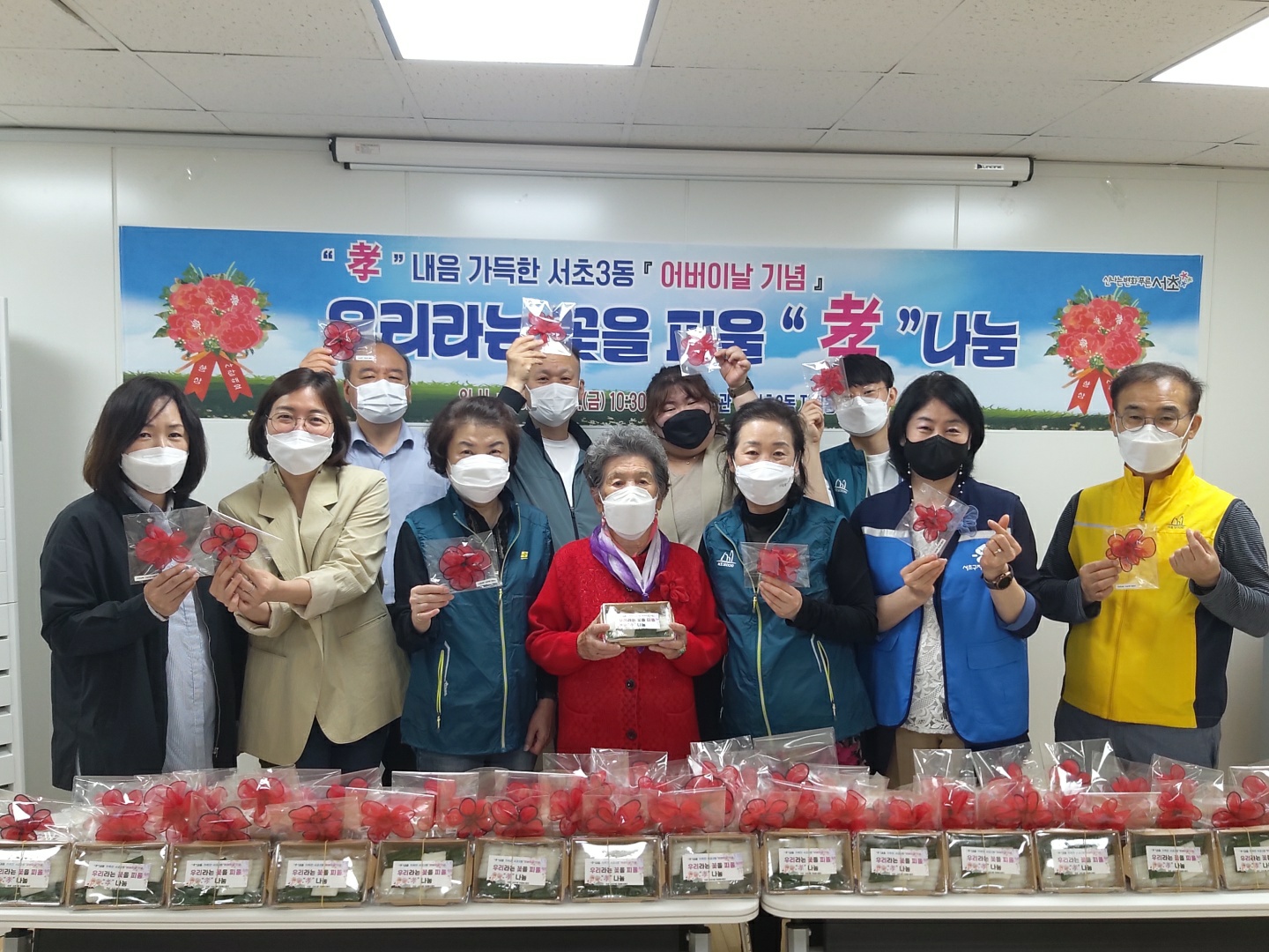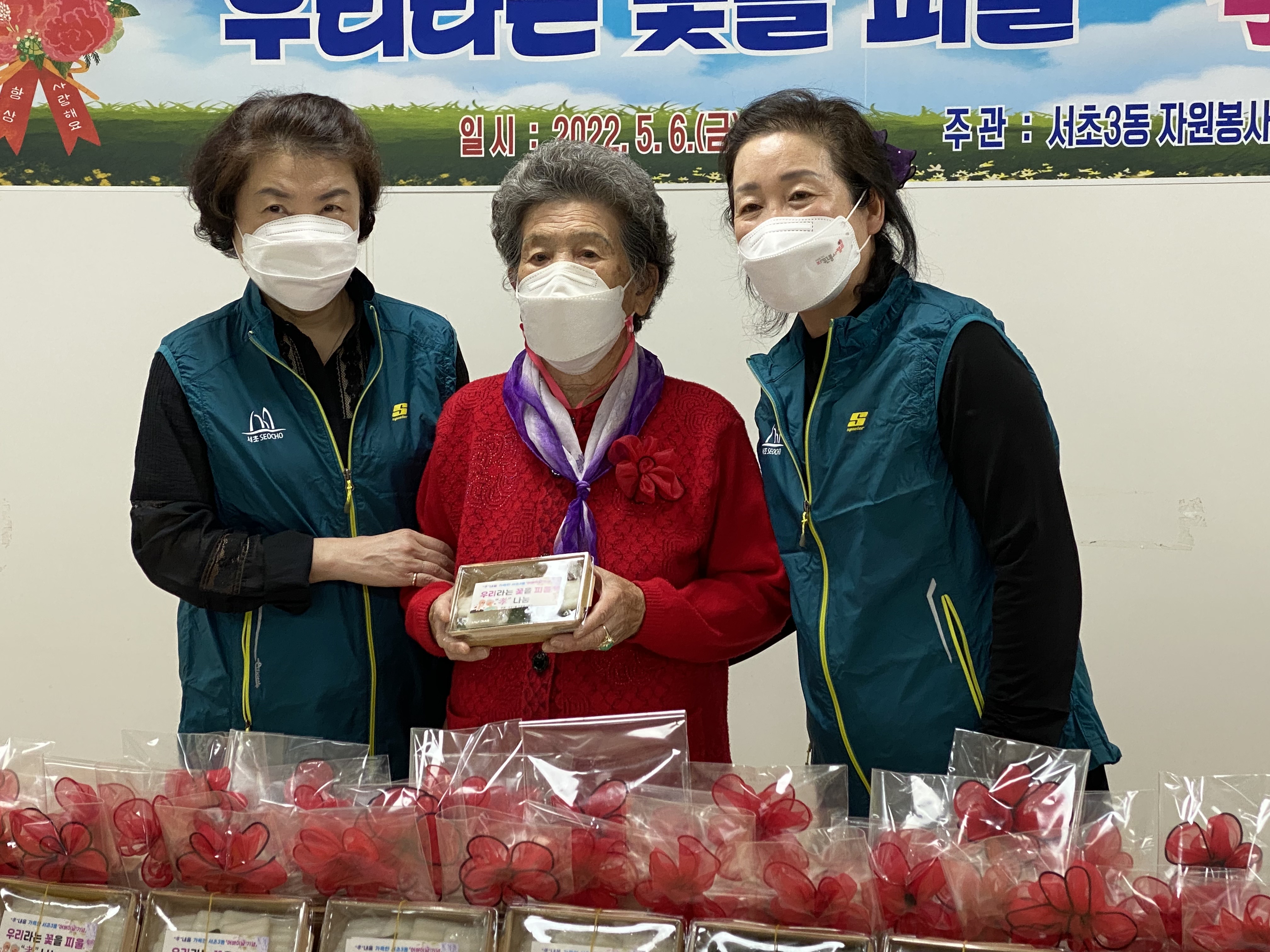카네이션 코사지와 떡은 당일 서초3동 지역 어르신들 60분께 전달드렸습니다.