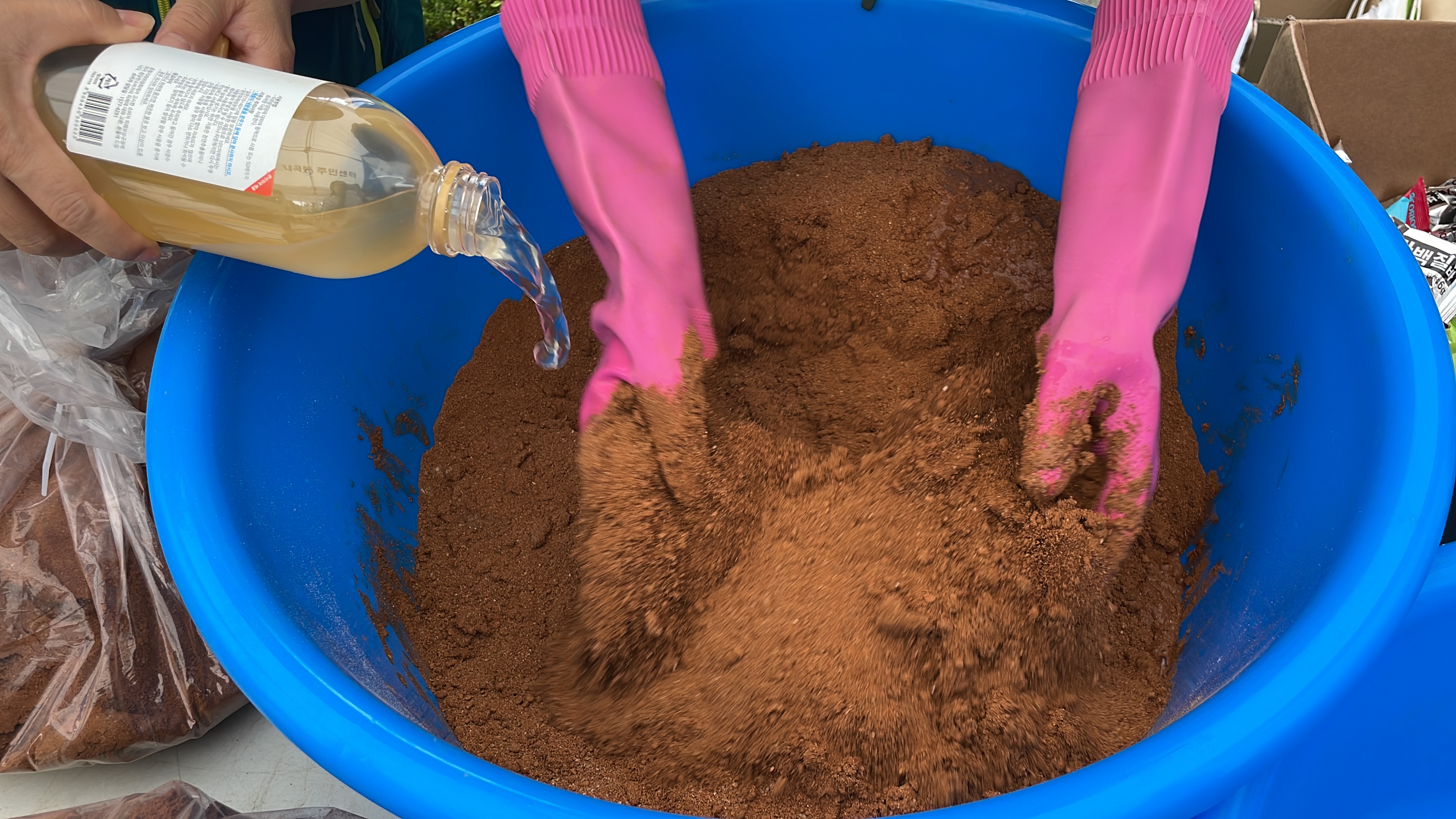 황토와 쌀겨가루를 섞은 이후에 발효액과 소량의 물을 넣어 반죽은 완성시켰습니다!