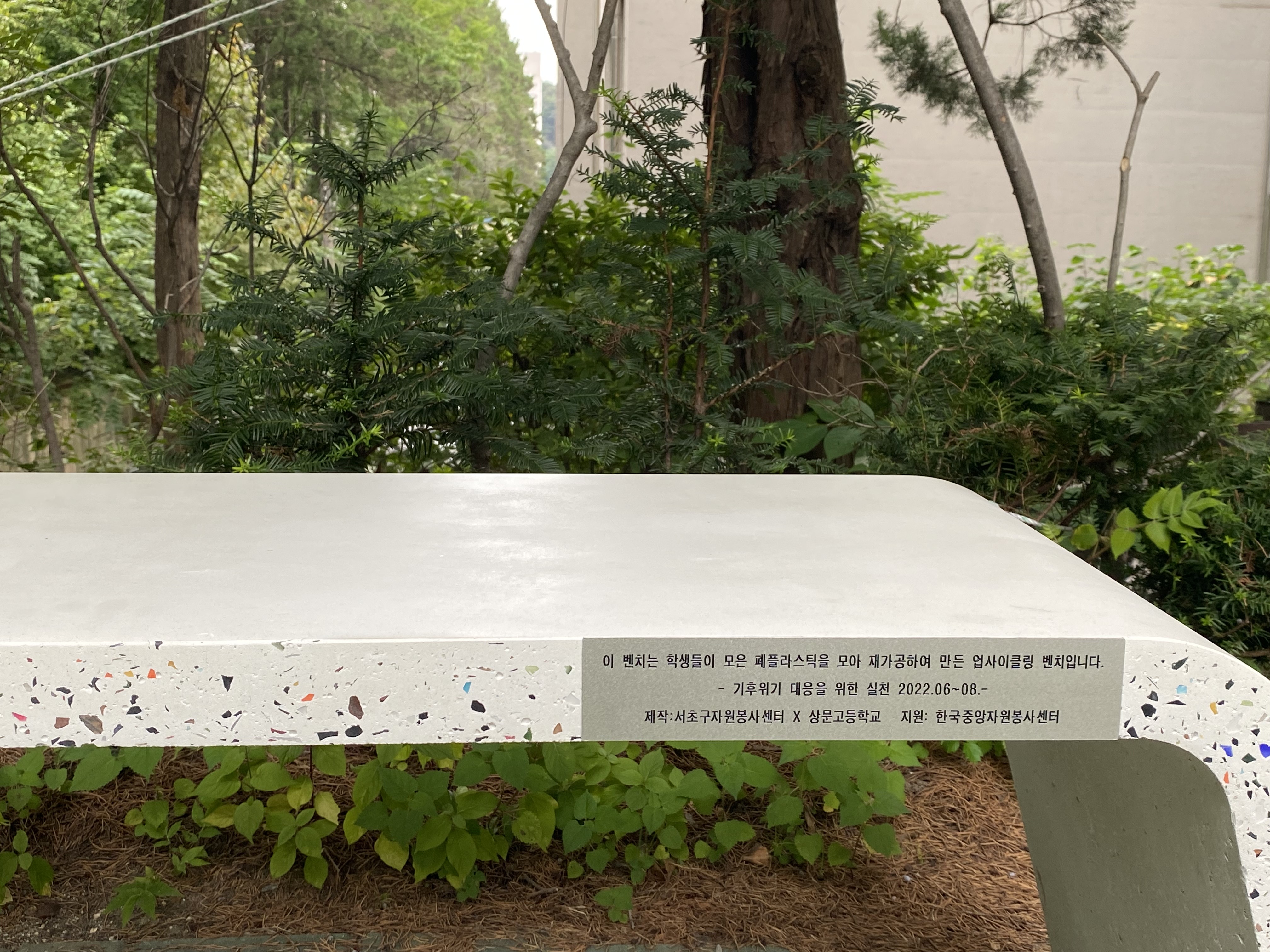 "이 벤치는 학생들이 모은 폐플라스틱을 모아 재가공하여 만들 업사이클링 벤치입니다."