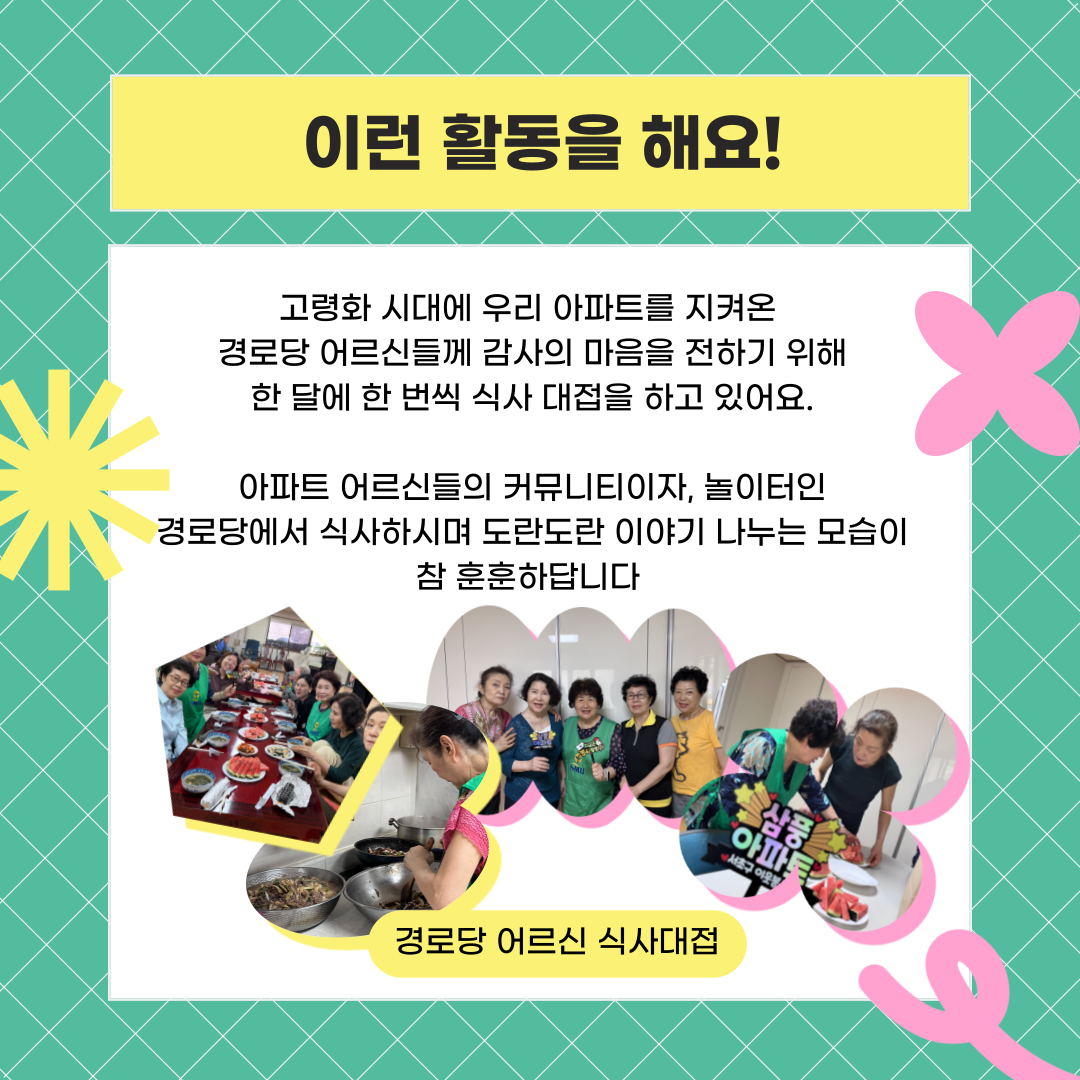 각 아파트별로 필요한 활동을 기획 및 진행하고 있는데요,