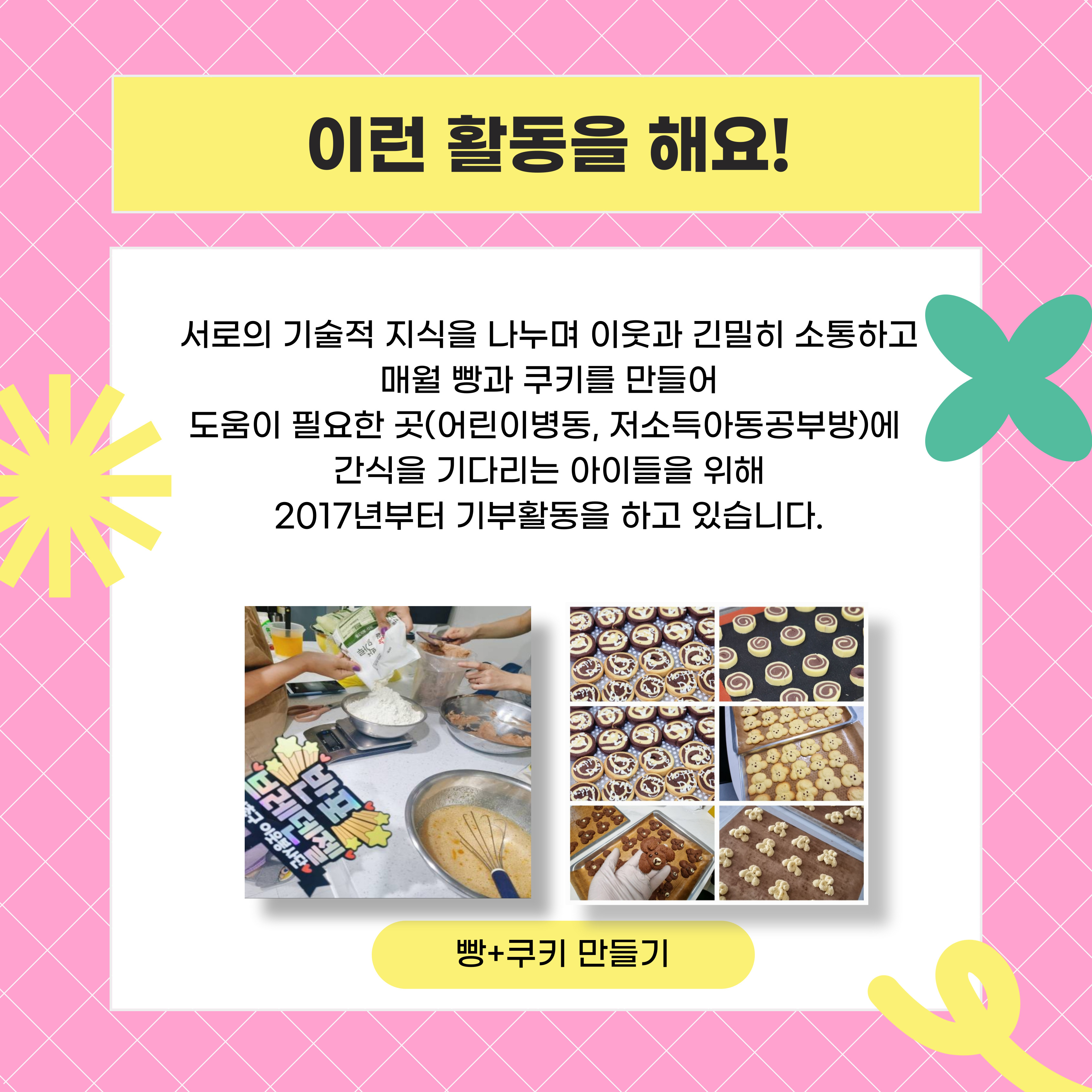 매월 빵과 쿠키를 만들어 도움이 필요한 곳(어린이 병동, 저소득 아동 공부방) 에